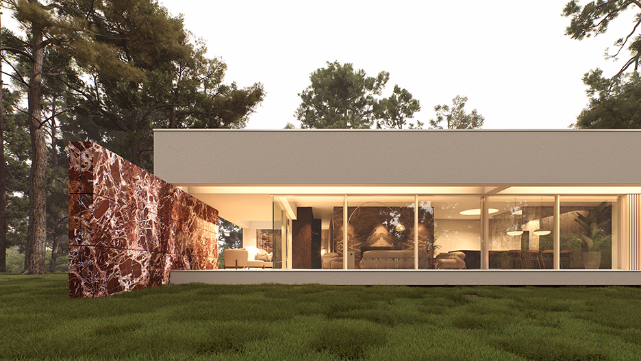 Charakterystyczna ściana obłożona kamieniem stanowi bezpośrednie nawiązanie do słynnego pawilonu w Barcelonie autorstwa Miesa van der Rohe. Ten monumentalny detal porządkuje przestrzeń, nadając jej ciężar i ponadczasową stabilność w organicznym otoczeniu lasu.
