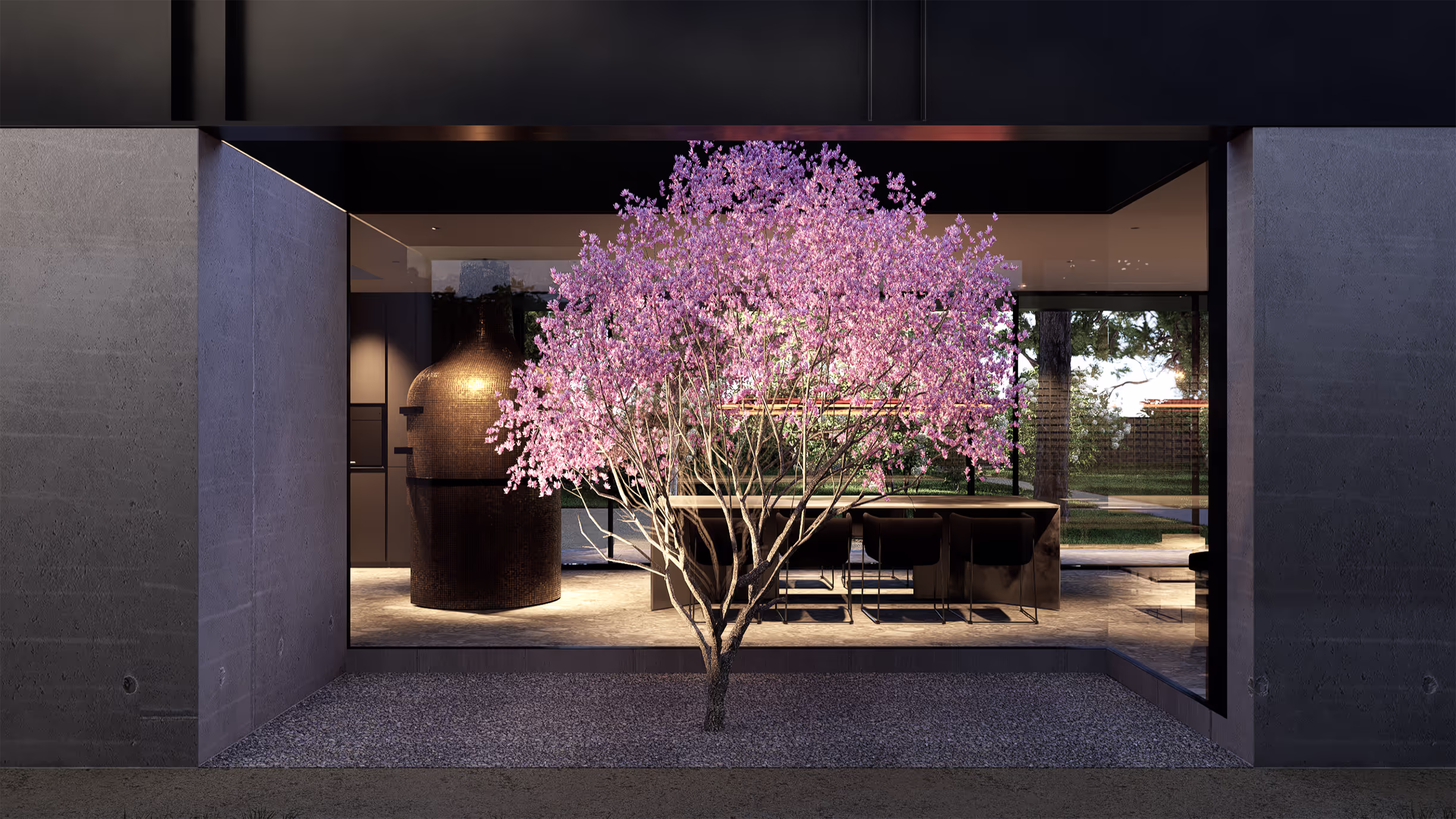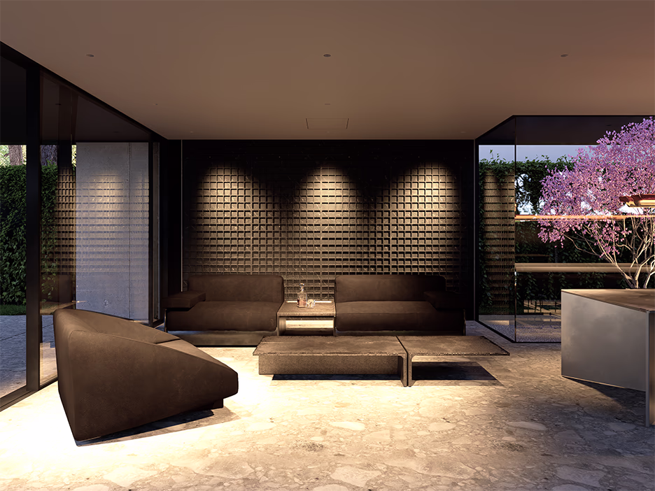 Pawilon Inżyniera to 150 m² bezwstydnie męskiej przestrzeni do wypoczynku i celebracji. Selekcja najlepszych włoskich mebli, bursztynowa poświata żywicznej lampy na zamówienie, ceramiczny piec do pizzy, kamień Ceppo di Gre rozciągający się poza ramy wnętrza — tu każdy detal ma charakter i każdy materiał ma swoje znaczenie