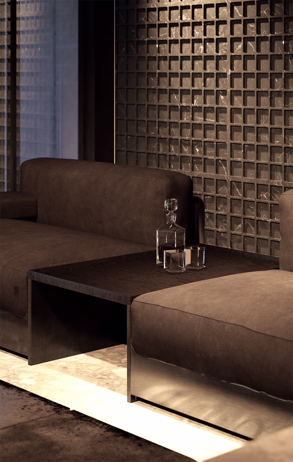Zestawienie kompozycji sofy Gattopardo ze stolikiem Echo na tle kamiennych tektonicznych modułów Checkmate są wstępem do klubowego i bezwstydnie męskiego charakteru pawilonu.