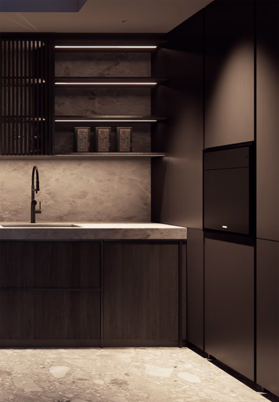 Kontrapunktem dla bryły pieca i jego mieniącego się wykończenia jest kompozycja kuchni Molteni Ratio z kamiennym blatem Monaco Grey i naturalnymi materiałami z palety szarości.
