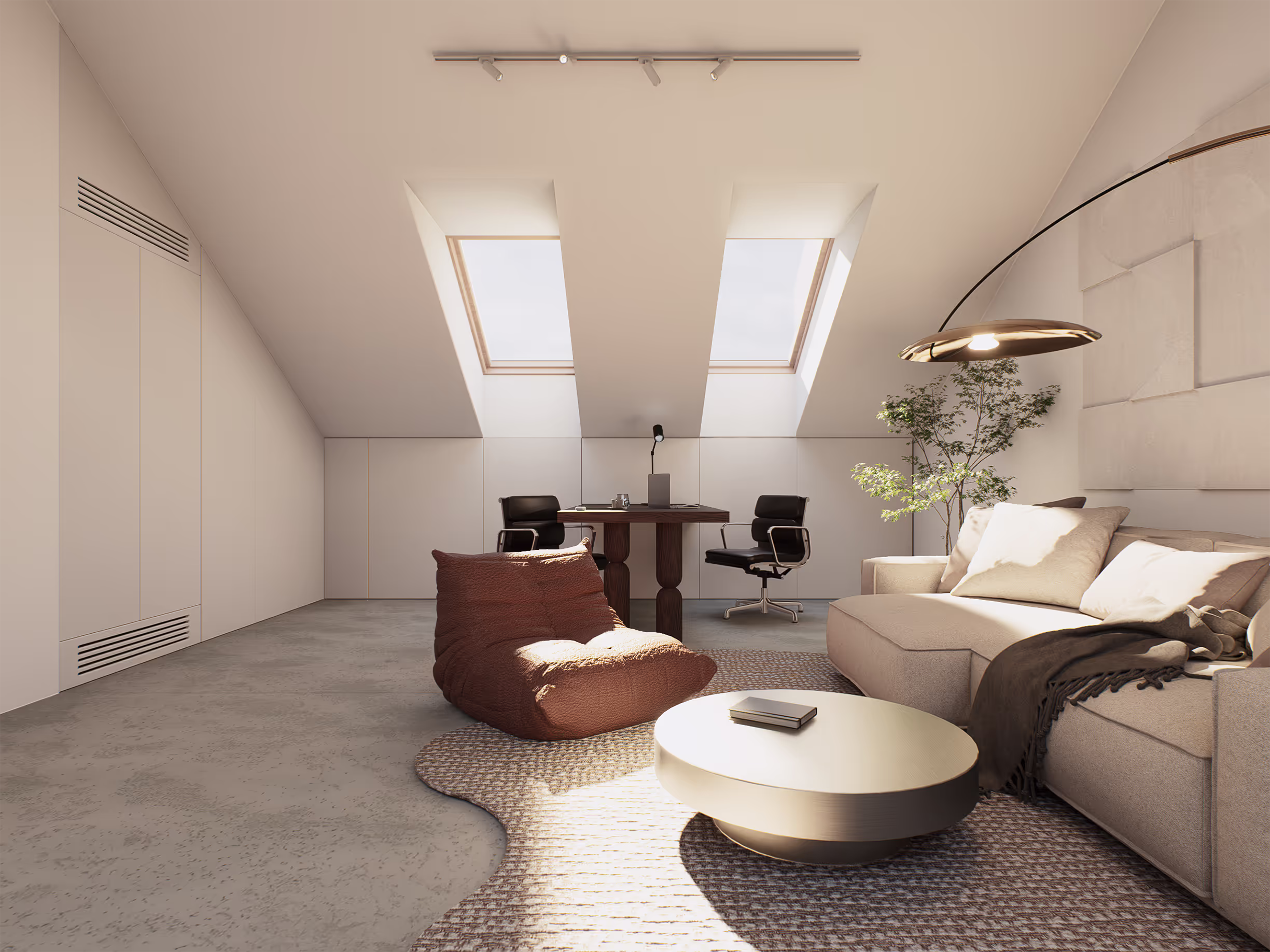 Gabinet to miejsce dualizmu – sterylna przestrzeń do pracy intelektualnej pary oraz strefa intensywnego wysiłku na trenażerach.