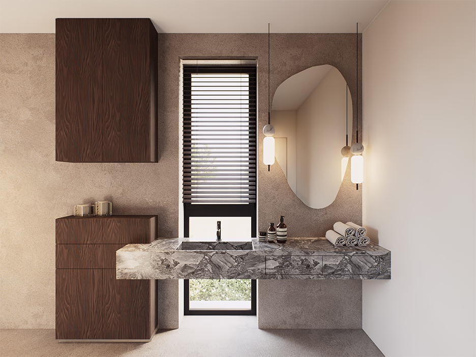 Ton wnętrzu nadaje wykonana na zamówienie umywalka z kamienia Bardiglio Nuvolato, której unikalne, dynamiczne użylenie staje się naturalnym obrazem w tej intymnej przestrzeni.
