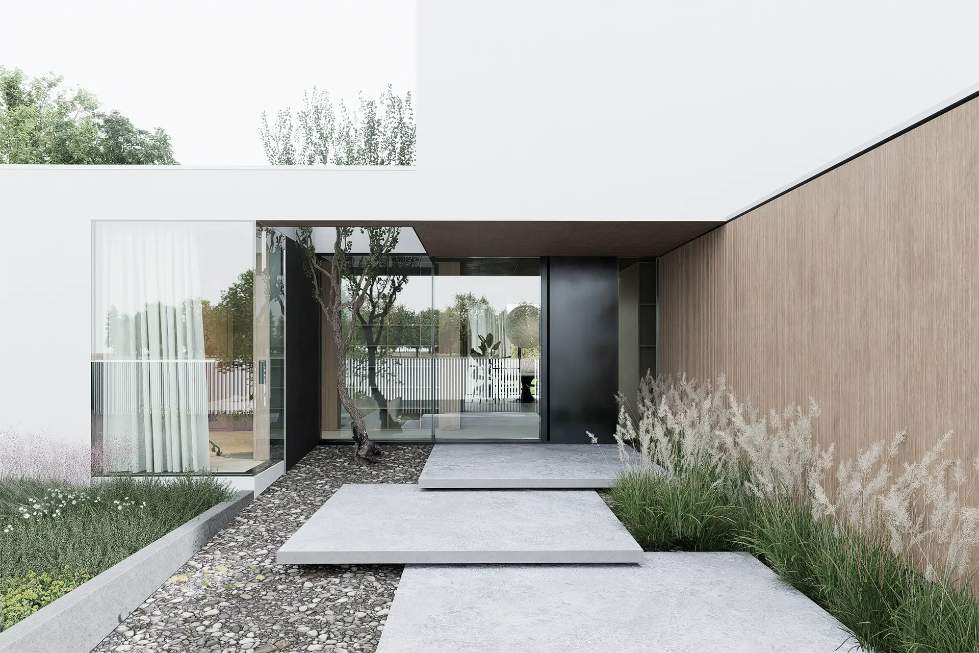 Elementom kompozycji daje wybrzmieć posadzka z kamienia Ceppo di Gre., która wychodząc poza ramy wnętrza wraz z metalową konstrukcją nawiązują do architektury rezydencji głównej.