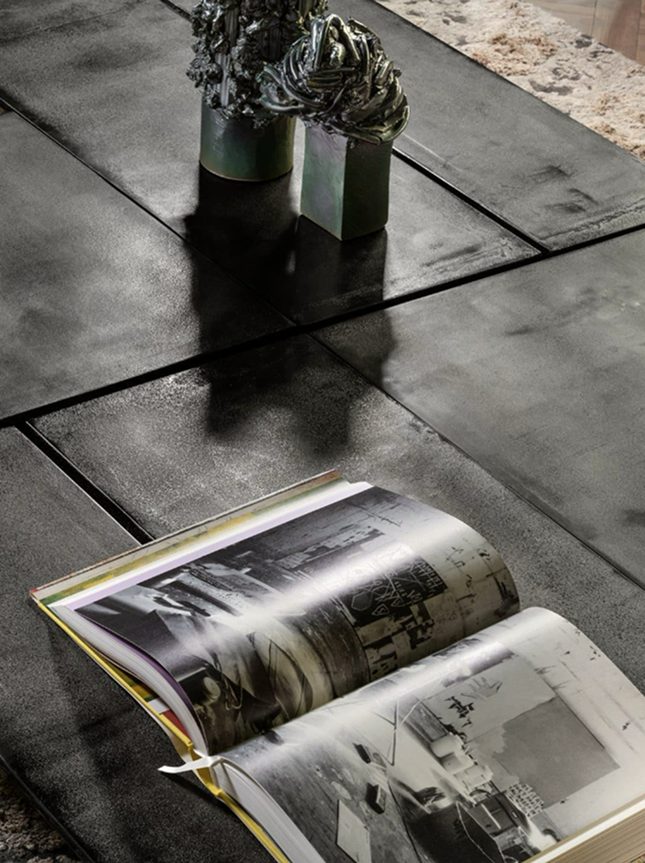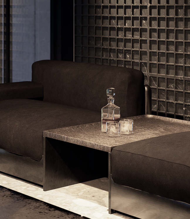 Zestawienie kompozycji sofy Gattopardo ze stolikiem Echo na tle kamiennych tektonicznych modułów Checkmate są wstępem do klubowego i bezwstydnie męskiego charakteru pawilonu.