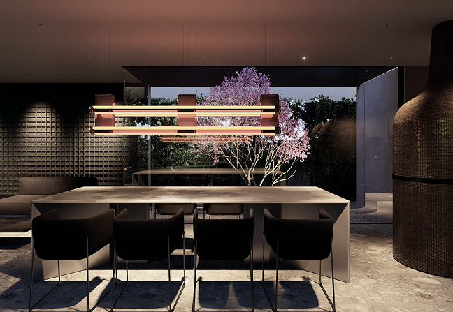 Jej ciepłe refleksy padają na stół Baxtera Y25 wykończonego postarzaną stalą Grisdore oraz na piec do pizzy Calabria pokrytego blaszaną mozaiką. Grę światła możemy podziwiać z krzesła Henge Jill.