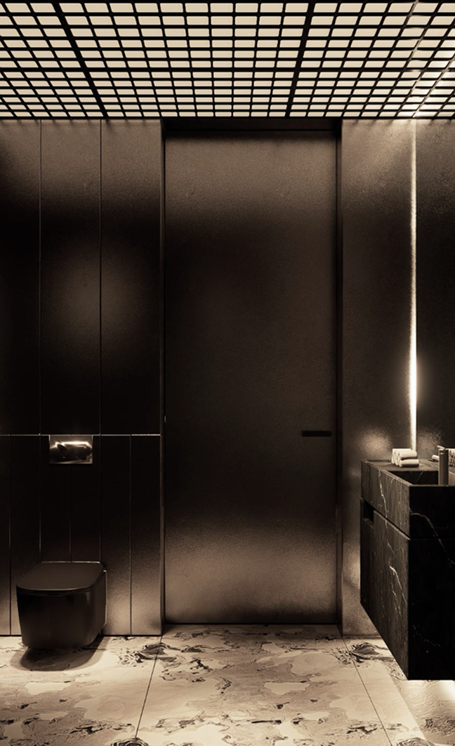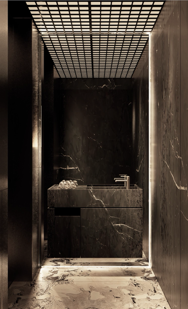 Elementom kompozycji daje wybrzmieć posadzka z kamienia Ceppo di Gre., która wychodząc poza ramy wnętrza wraz z metalową konstrukcją nawiązują do architektury rezydencji głównej.